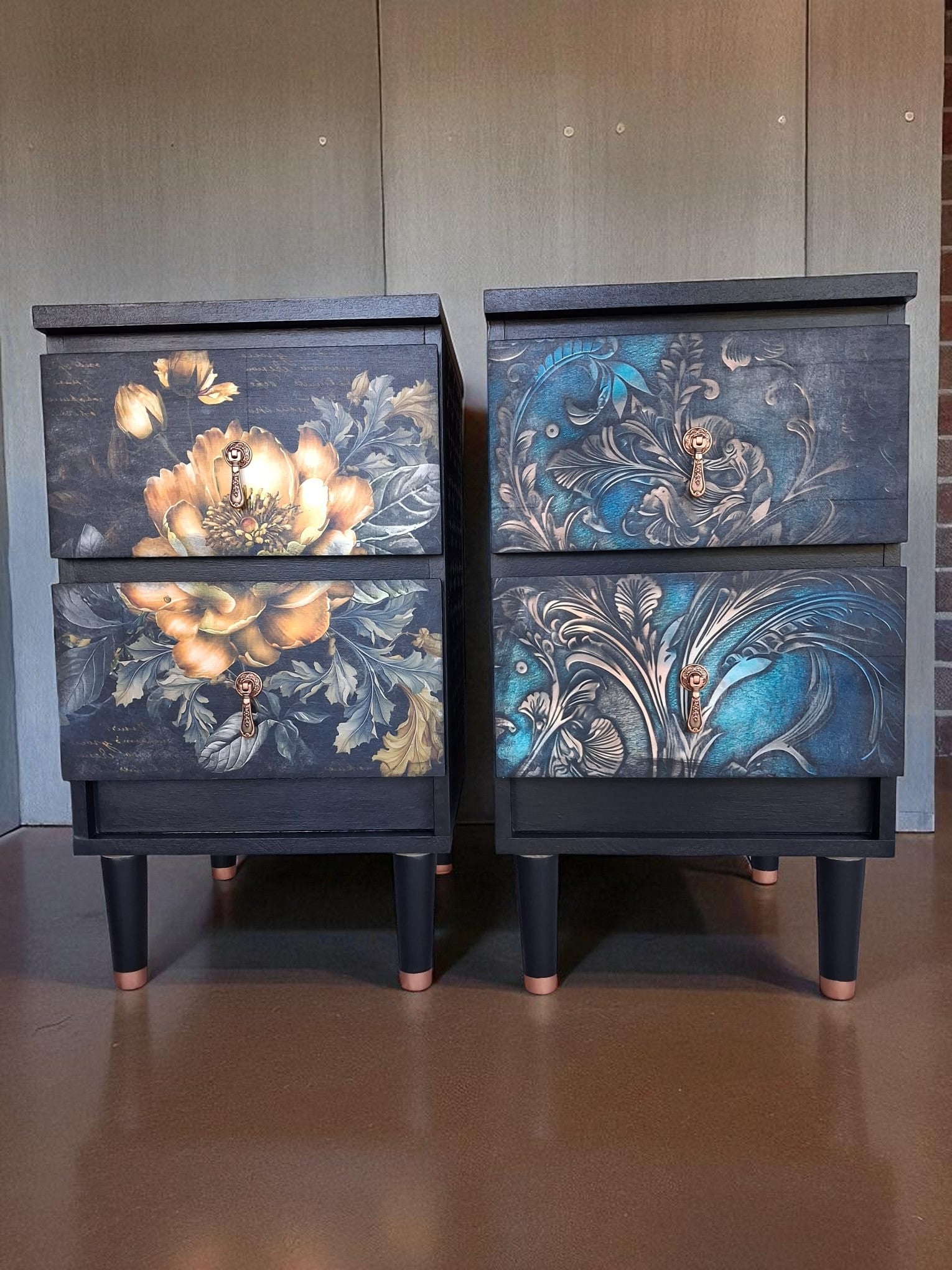 Pintadas a mano en negro mate con elegantes frentes en decoupage floral, detalles en esténcil damasco en los laterales y patas estilizadas con puntas en color cobre. Acabadas con tiradores dorados vintage que aportan un toque artístico y atemporal.