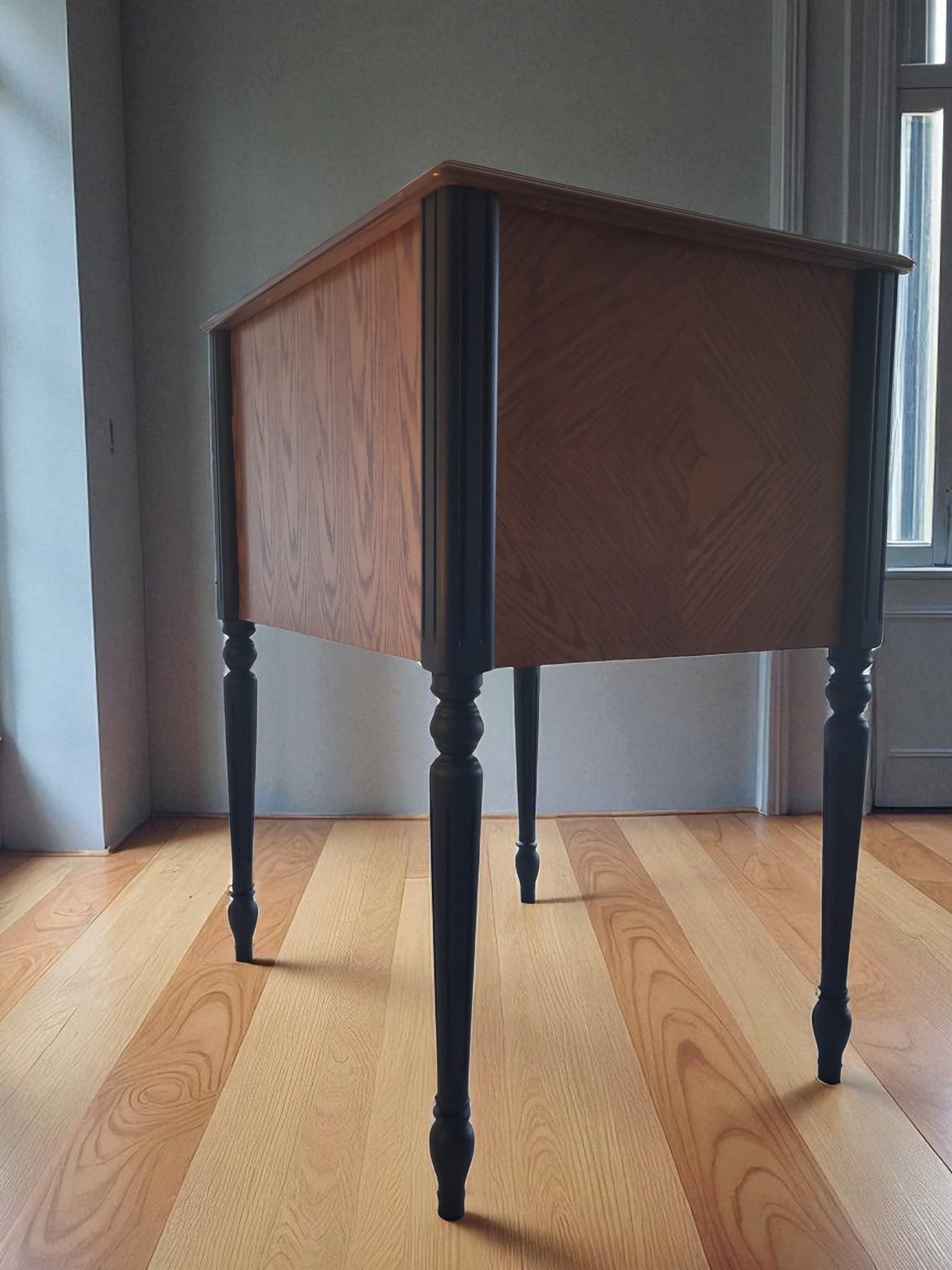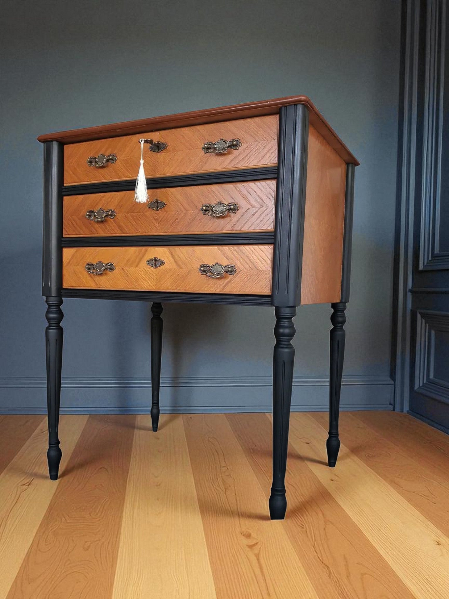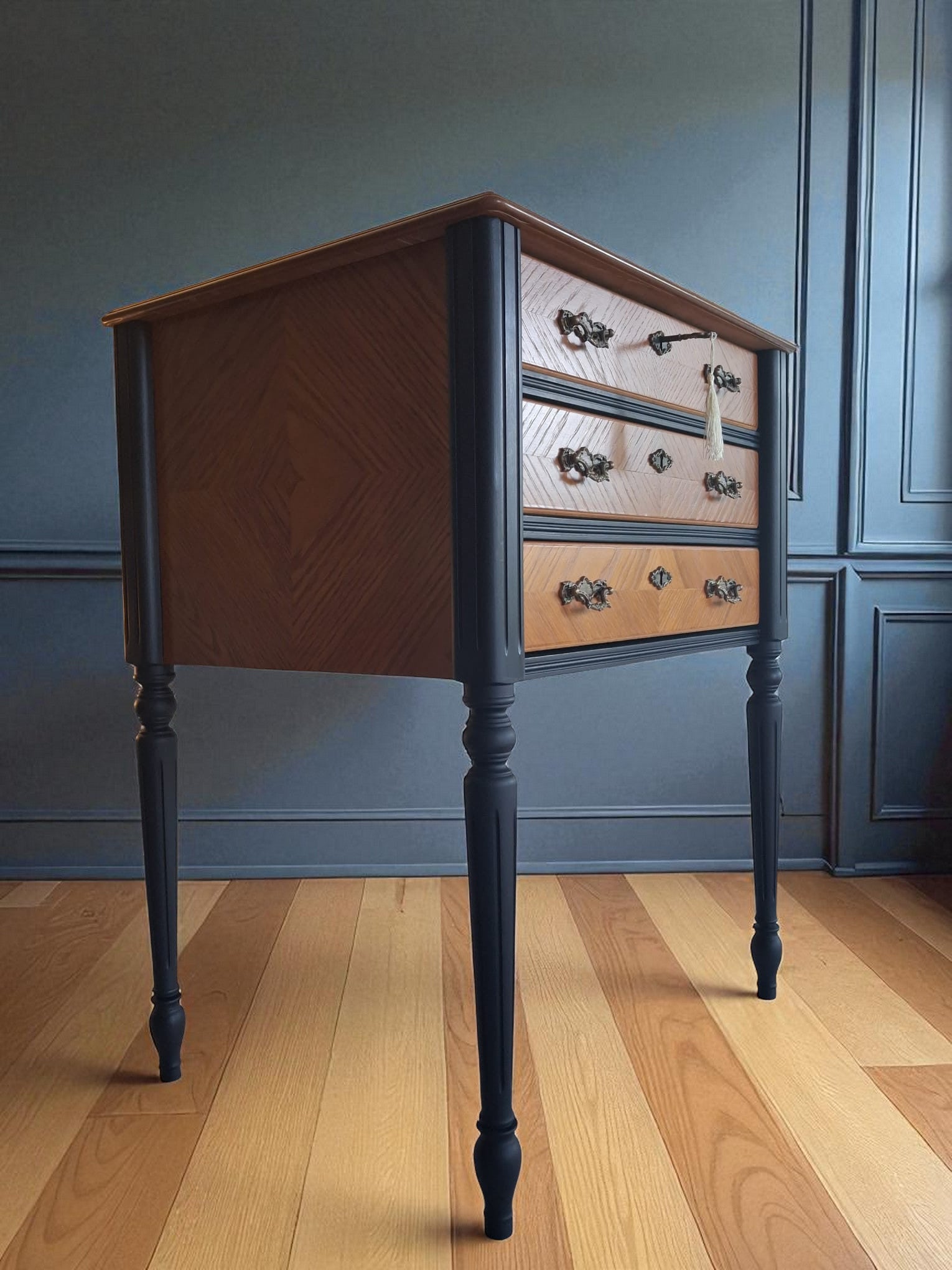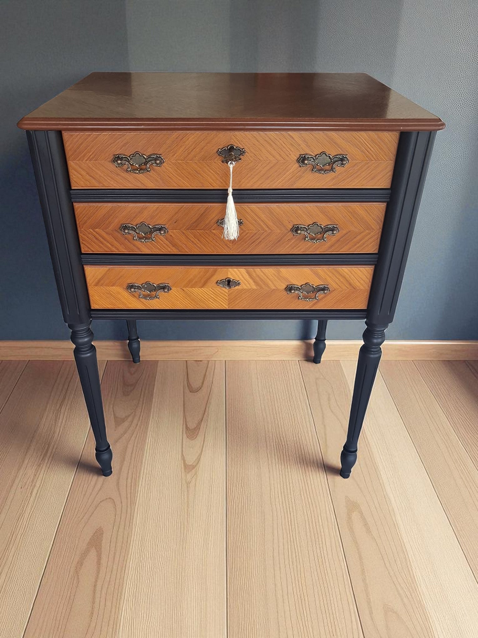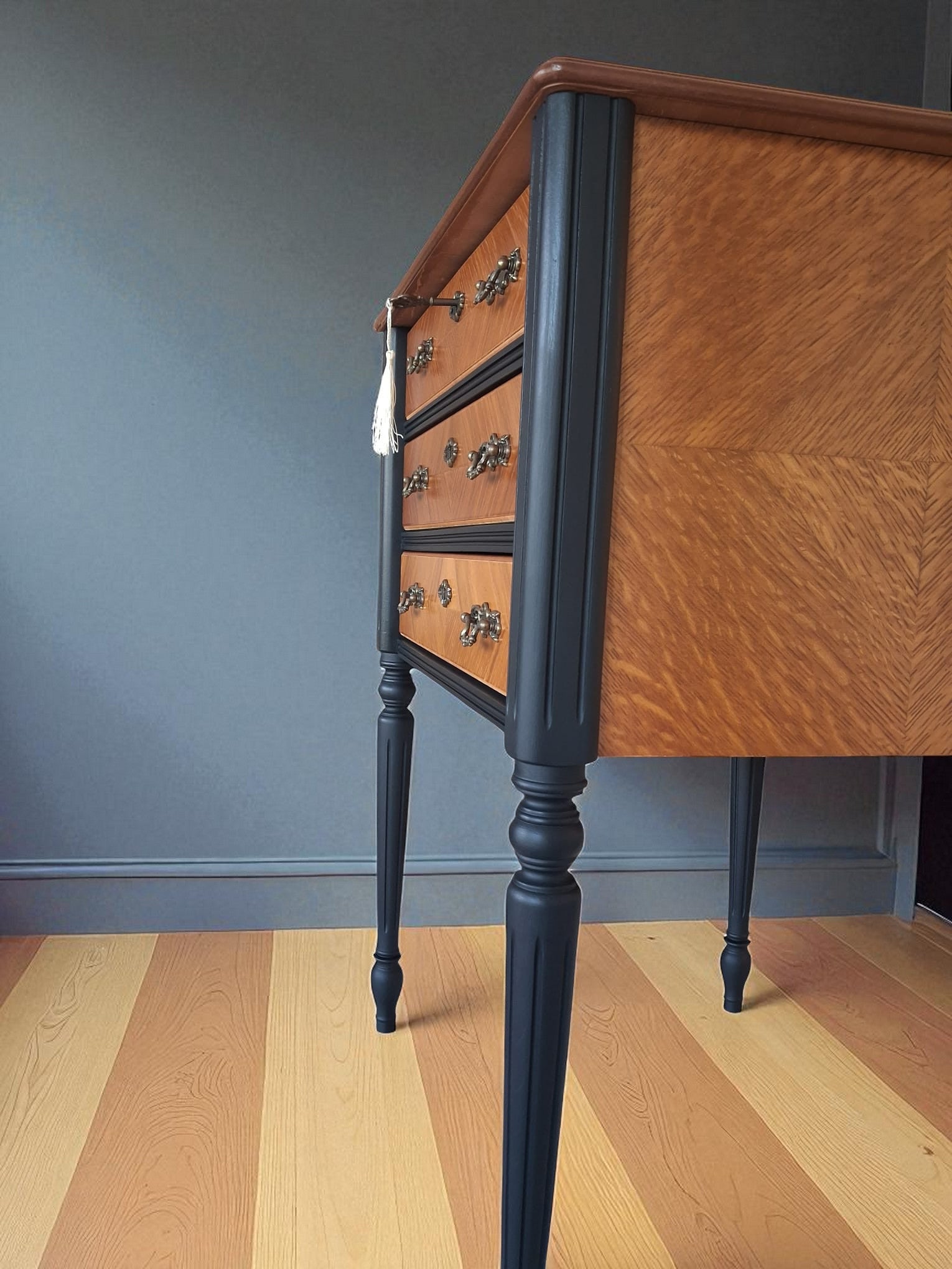 Ha sido renovada con pintura y cera al agua, respetando su esencia original pero con un acabado más fresco y sostenible. Conserva todos sus elementos originales: tiradores en bronce dorado, patas torneadas y su pátina original, todo en excelente estado. Tiene más de 70 años de antigüedad.